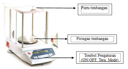 • Tombol pengaturan untuk mengatur timbangan analitik seperti tombol ON/OFF untuk menghidupkan dan mematikan timbangan, Tera untuk mengembalikan ke posisi “nol” saat meletakkan wadah sampel dan Mode untuk mengonversi satuan pada saat menimbang.